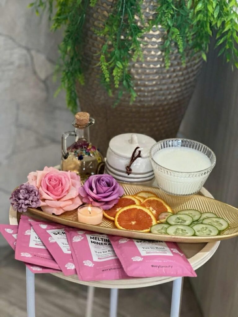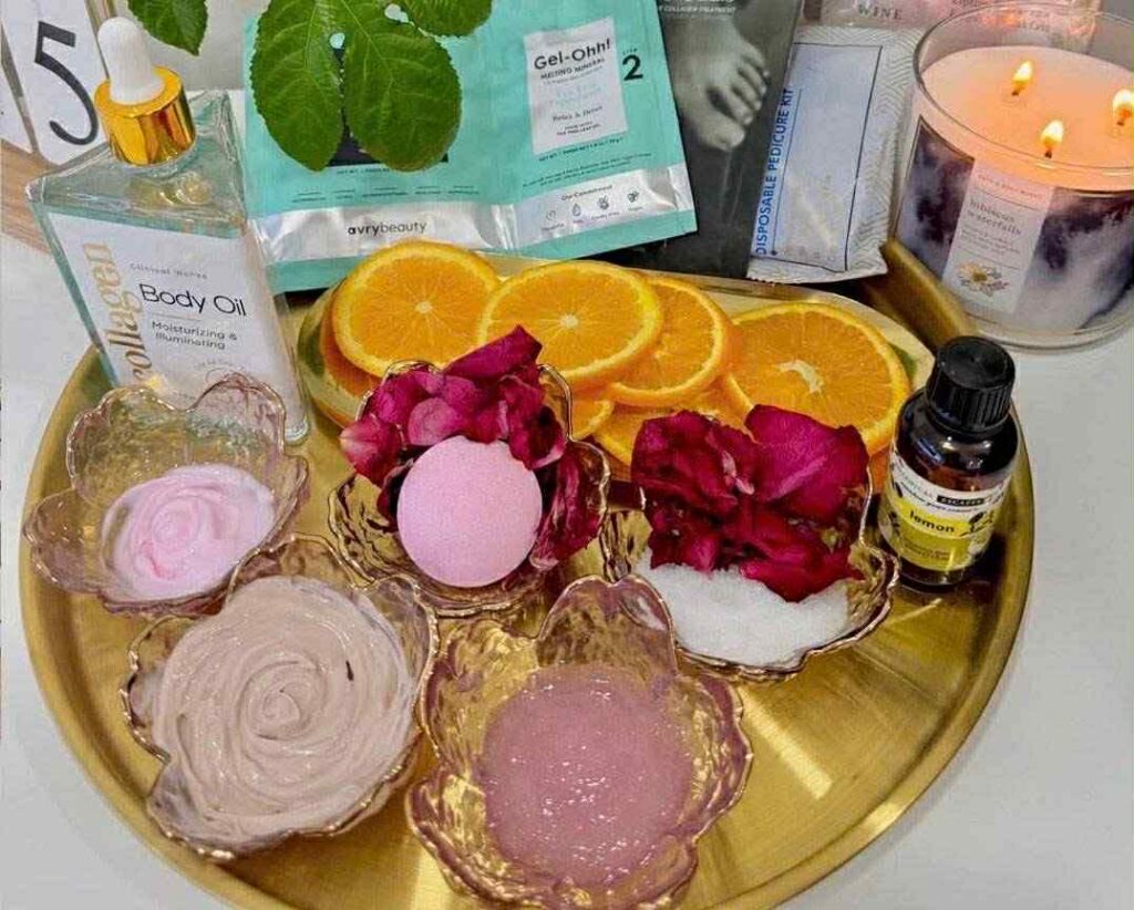 Indulge in a champagne soak with rose petals, followed by a milk and honey citrus scrub that nourishes skin and fights aging by neutralizing free radicals. Enjoy sea salt exfoliation, a collagen mask, and collagen cream, finishing with deeply moisturizing collagen socks, massage oil candle and spa steamer.